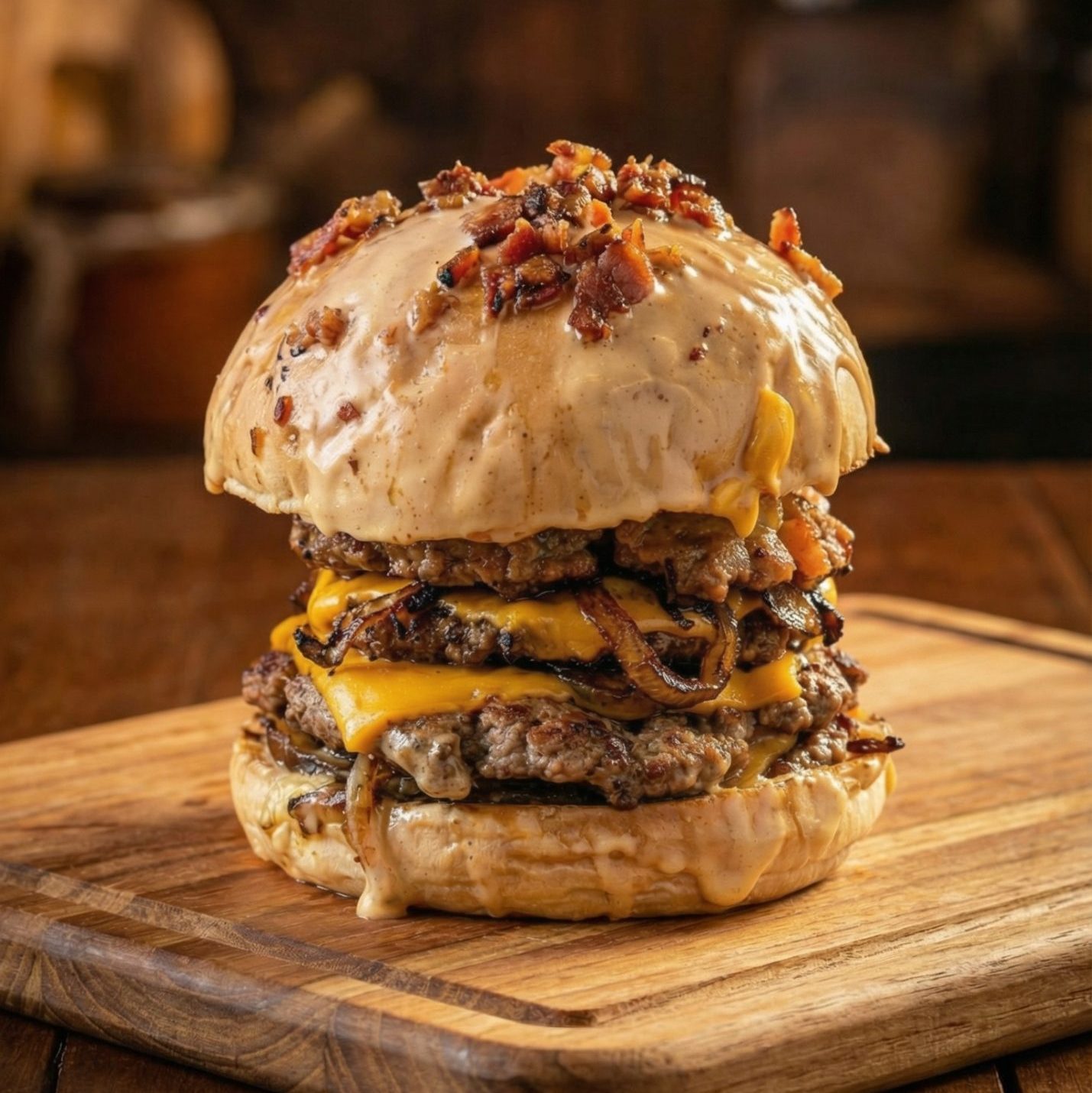 Pan artesanal, cuádruple carne de 100g, cuádruple queso cheddar, cheddar derretido, bacon en cubitos, cebolla crispy y la salsa de la casa.